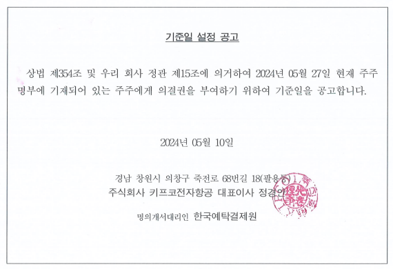 임시주주총회 기준일 설정 공고 첨부파일 KIPCO 2024-05-10 기준일 설정 공고 상법 제354조 및 우리 회사 정관 제15조에 의거하여 2024년 05월 27일 현재 주주명부에 기재되어 있는 주주에게 의결권을 부여하기 위하여 기준일을 공고합니다. 2024년 05월 10일 경남 창원시 의창구 죽전로 68번길 18(팔용동) 주식회사 키프코전자항공 대표이사 정경안 이전 다음